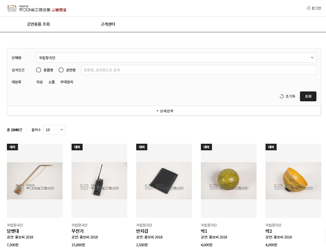 공연 용품 온라인 대여 서비스 문의 국립극장 무대예술지원센터 031-870-9106