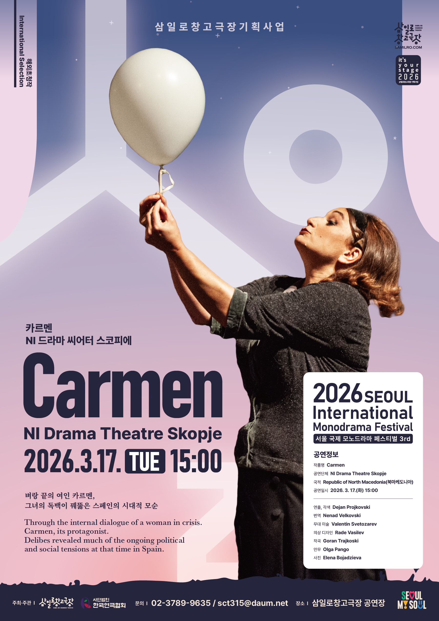 연출, 각색 : 데얀 프로이코프스키 Dejan Projkovski 배우 : 빌랴나 드라기체비치-프로이코프스카 Biljana Dragićević-Projkovska 무대 미술 : 발렌틴 스베토자레프 Valentin Sveiozarev 의상 디자인 : 라데 바실레프 Rade Vasilev 작곡 : 고란 트라이코스키 Goran Trajkoski 안무 : 올가 판고 Olga Pango 사진 : 엘레나 보야지예바 Elena Bojadzieva 개요: 미겔 델리베스의 걸작 <마리오와 함께한 5시간>은 지난 세기 중반 스페인 문학의 매우 중요한 흐름이었던 ‘사회적 사실주의’를 충실하게 보여주는 표본으로 손꼽힌다. 위기에 처한 여주인공 ‘카르멘’의 내면 독백을 통해, 당시 스페인 사회에 끊임없이 감돌던 정치적·사회적 긴장감을 가감 없이 드러냈다. |