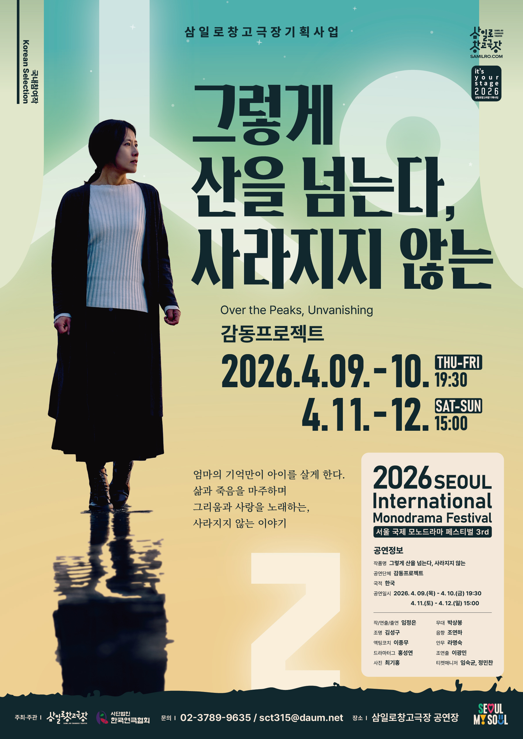 개요 : 상흔에 관한 기록, 부재에 관한 기억을 공유하며 지속가능한 위로와 연대를 제안한다. 본 작품은 2016년 초연된 <그렇게 산을 넘는다>에 기반해 1인극으로 재구성하여, 상실의 아픔과 부재의 그리움을 아빠의 입장에서 담담하게 표현하며 잊으려 해도 ‘사라지지 않는’ 고통과 기억, 그리고 산을 오르며 터져 나오는 감정의 충돌을 보여주었다. |
