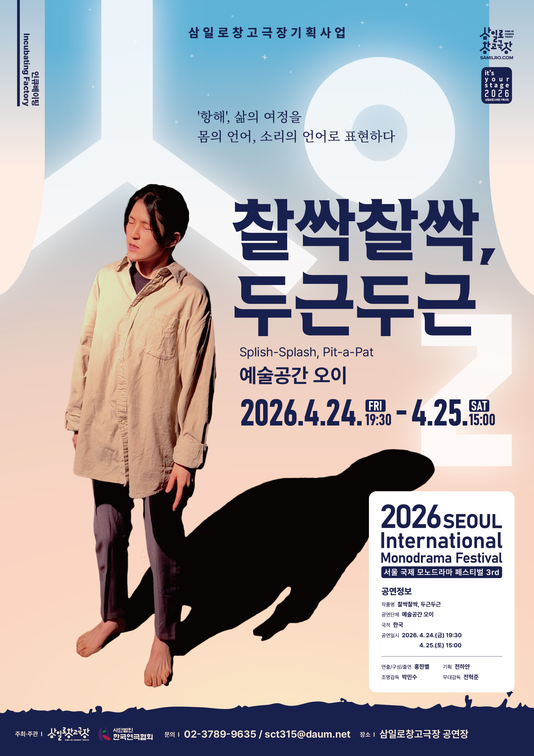 개요 : 1905년 4월, 1,033명의 한인들은 부푼 꿈을 안고 멕시코로 향한다. 그들의 항해는 우리의 삶과 닮아 있다. 어디에 도착할지, 얼마나 걸리지 알 수 없는 곳을 향해 우리는 나아간다. 어디로 가야 할까라는 것은 어떻게 살아갈 것인가에 대한 이야기다. 어디서 왔는지 알아야 어디로 가는지 알 수 있다. <찰싹찰싹, 두근두근>은 의성어·의태어로 쓰인 대사와 배우의 움직임으로 삶의 여정을 표현한 작품이다. 간결한 표현과 빈 무대 너머의 것을 관객 스스로 채우기를 바란다. |