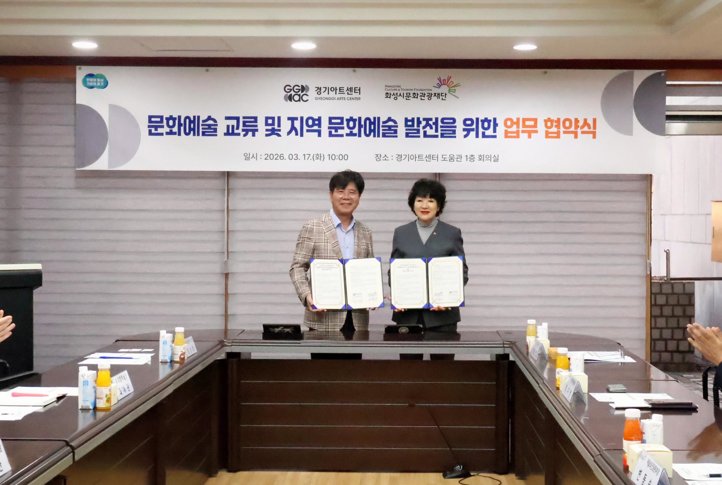 [플레이뉴스 문성식기자] 경기아트센터(사장 김상회)와 화성시문화관광재단(대표이사 안필연)은 3월 17일 경기아트센터 회의실에서 지역 문화예술 발전과 도민 문화향유 기회 확대를 위한 업무협약(MOU)을 체결했다.
