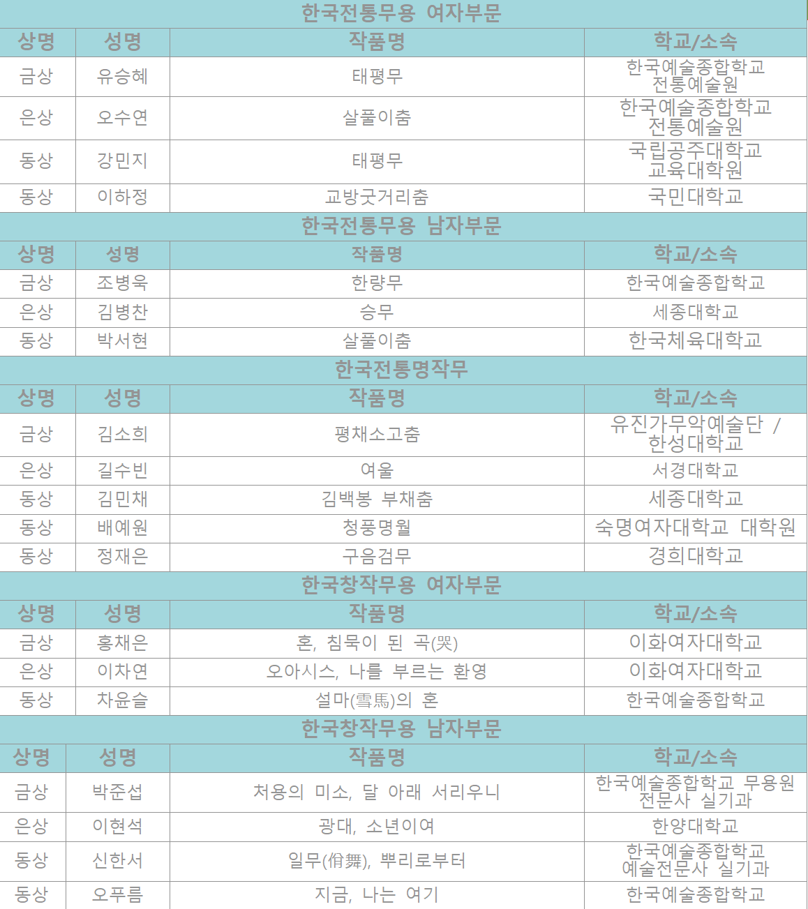 특히 본 대회는 한국 무용의 기틀을 마련한 1세대 무용가들의 업적을 기리고 젊은 예술가들의 창작 의욕을 고취하기 위해 특별상을 시상하고 있어 그 의미가 더욱 깊다. 부문별 최고 득점자에게 수여되는 특별상과 상금 200만 원의 주인공은 다음과 같다.