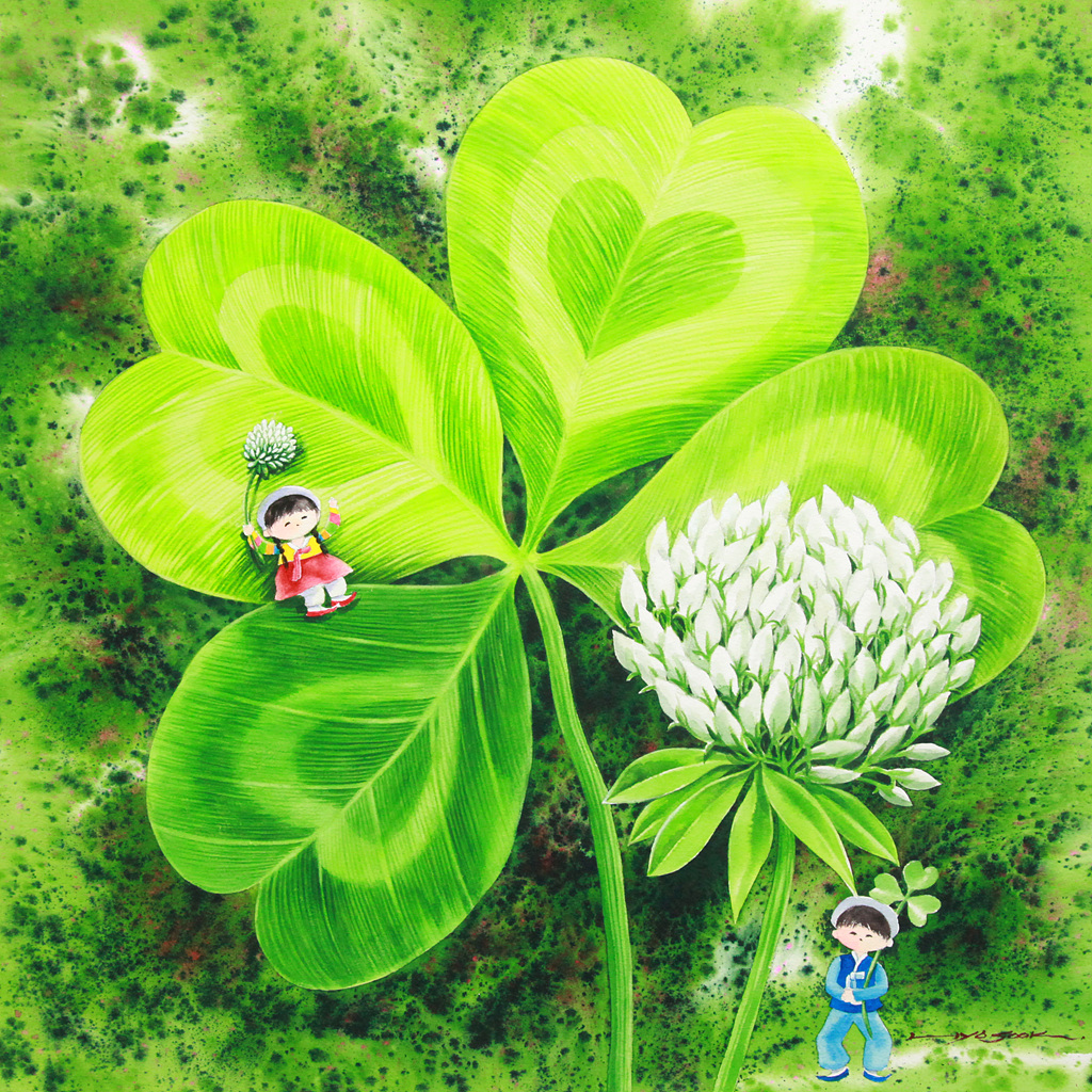 중앙의 네 잎 클로버는 하트 형태를 띠며 사랑, 행운, 소망의 의미를 동시에 품고 있다.