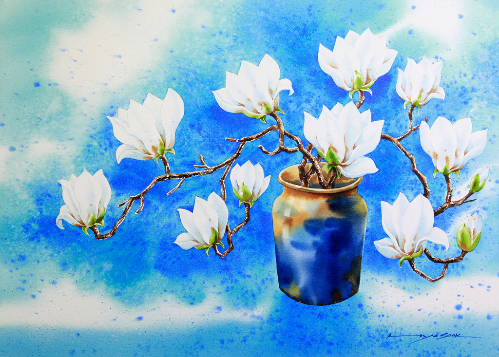 푸른 색조가 중심을 이루는 배경은 마치 봄날의 하늘과 물의 경계를 흐릿하게 겹쳐 놓은 듯한 분위기를 자아내며 그 위에 놓인 목련 가지와 화병은 정적이면서도 생명력 있는 존재로 부각시켰다.