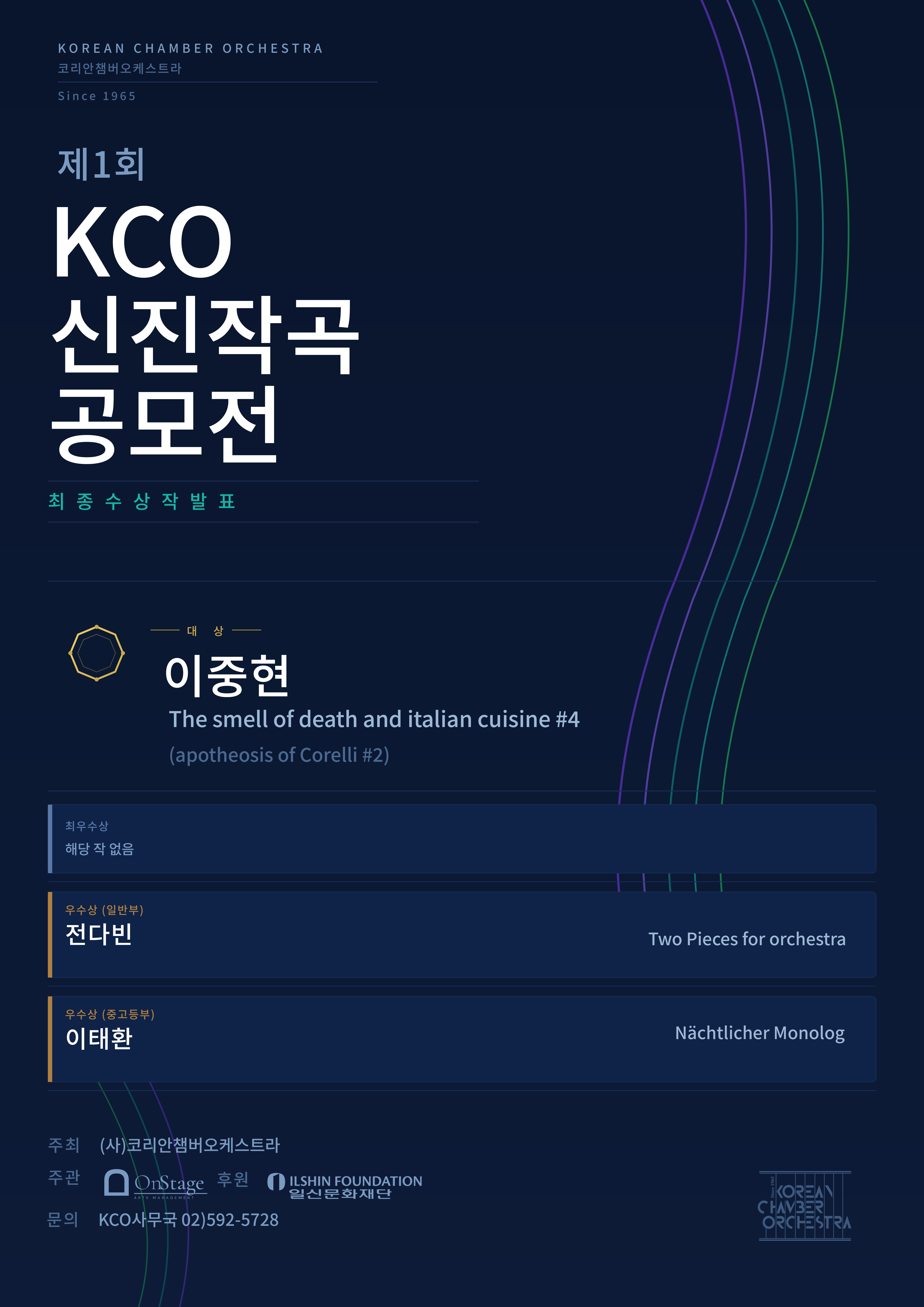 심사는 KCO 음악감독 김 민을 비롯해 서울대학교 음악대학 작곡과 최우정 교수, 상명대학교 음악학부 뉴미디어작곡과 정승재 교수가 참여했다. 독창성과 기술적 완성도, 예술성을 기준으로 엄정하고 심도 있는 평가가 이루어졌다.