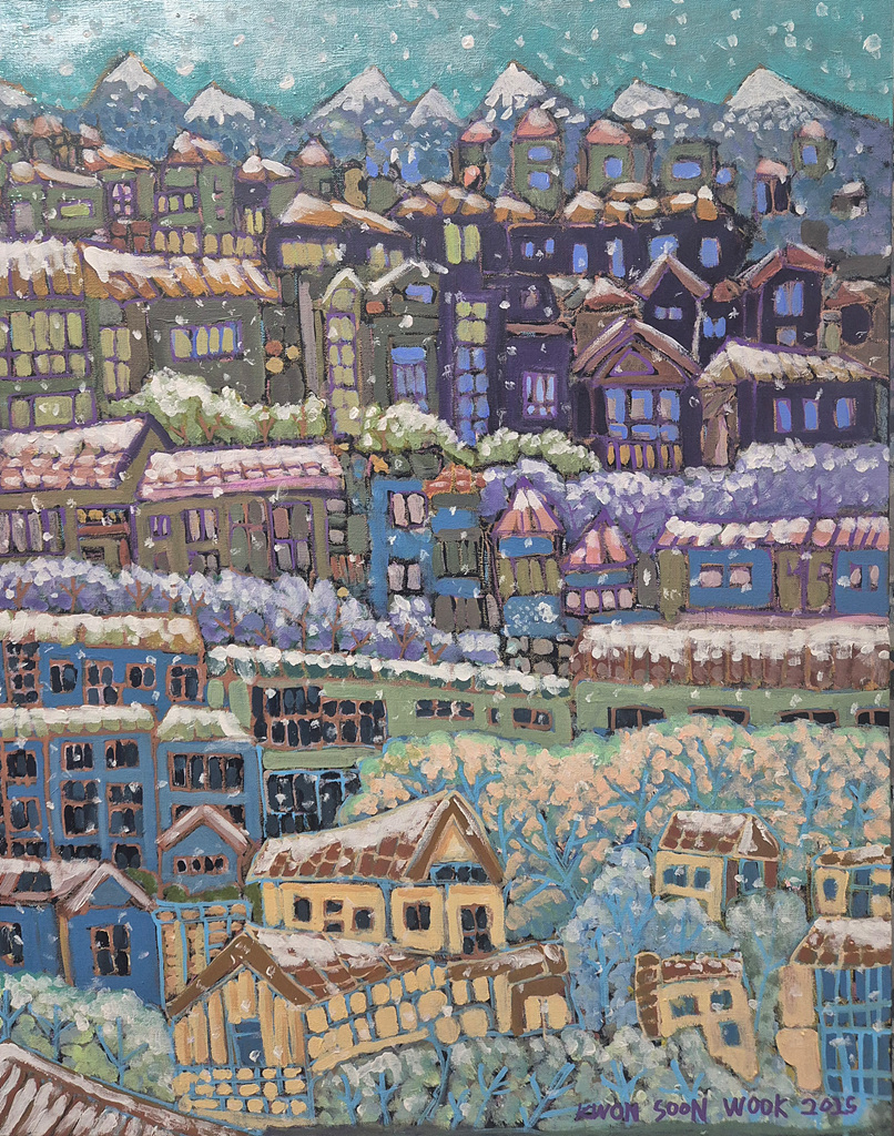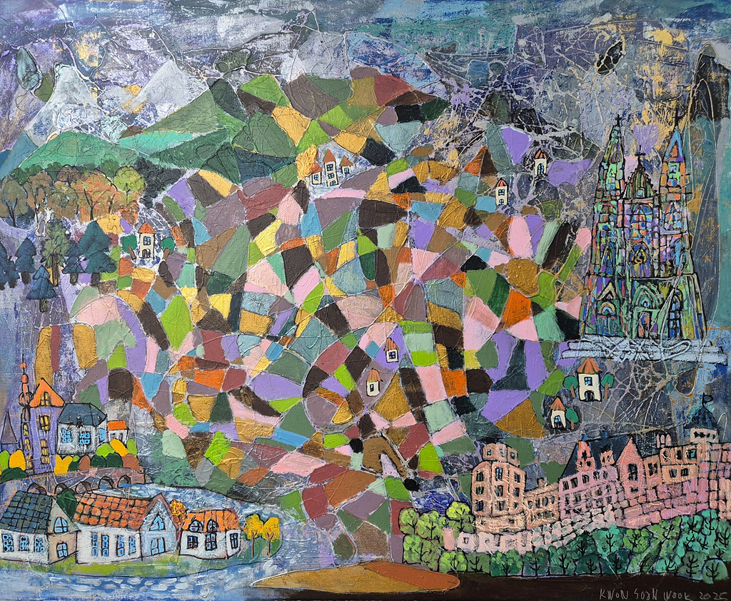 작품명 "안식의도시_하이델베르크"는 캔버스 전체를 채운 다채로운 색상들은 마치 유리 조각을 이어 붙인 듯한 구조를 이루며, 하나의 고정된 시점이 아닌 여러 시선과 시간의 흔적이 중첩된 풍경을 형성한다.