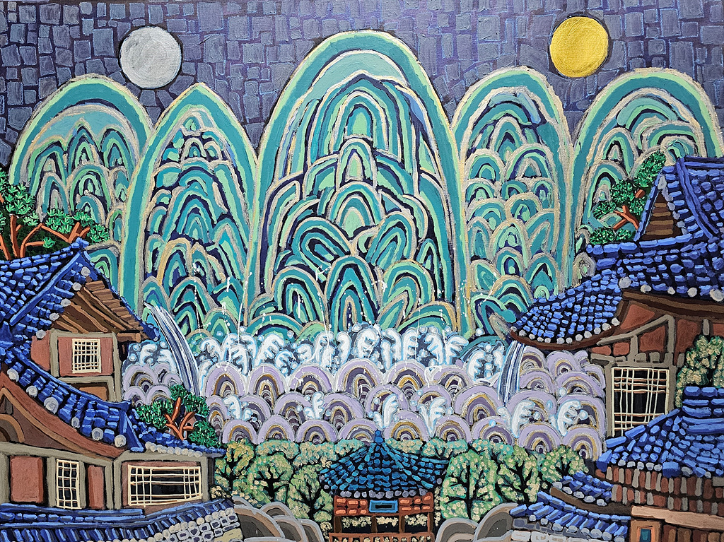 특유의 질감 표현과 구성의 변화를 통해 과거와 현재가 공존하는 미감을 선사하고, 화면 하단에 전통 한옥과 정자를 배치함으로써 왕실의 위엄을 민간의 삶이나 구체적인 풍경의 영역으로 끌어들였다.