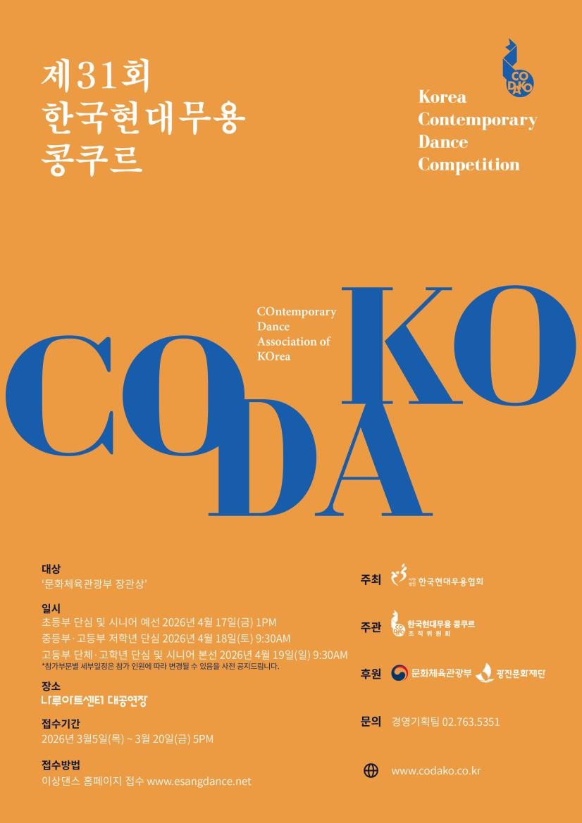 경연명 : 제31회 한국현대무용 콩쿠르 경연일 : <초등부 단심 및 시니어 예선> 2026년 4월 17일(금) 1PM <중등부·고등부 저학년 단심> 2026년 4월 18일(토) 9:30AM <고등부 고학년 단심 및 시니어 본선> 2026년 4월 19일(일) 9:30AM 장 소 : 나루아트센터 대공연장 주 최 : (사)한국현대무용협회_codako.co.kr 주 관 : 한국현대무용 콩쿠르 조직위원회 후 원 : 문화체육관광부, 광진문화재단 조직위원장 : 김형남((사)한국현대무용협회 이사장, 세종대학교 교수) 예술감독 : 신창호 심사위원장 : 최상철 사무국장 : 강수연 경영기획팀 : 손아율, 나정은 홍보마케팅팀 : 이숙현, 송정화 사진 및 영상 : Hanfilm |